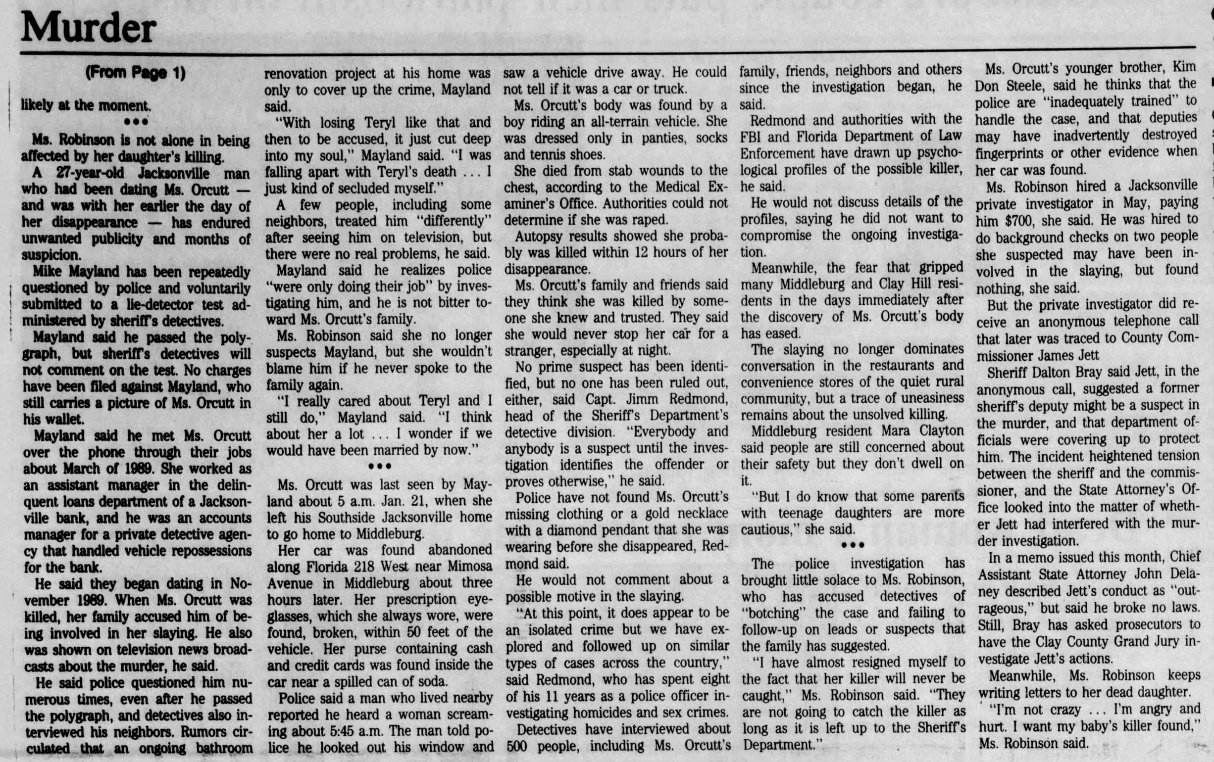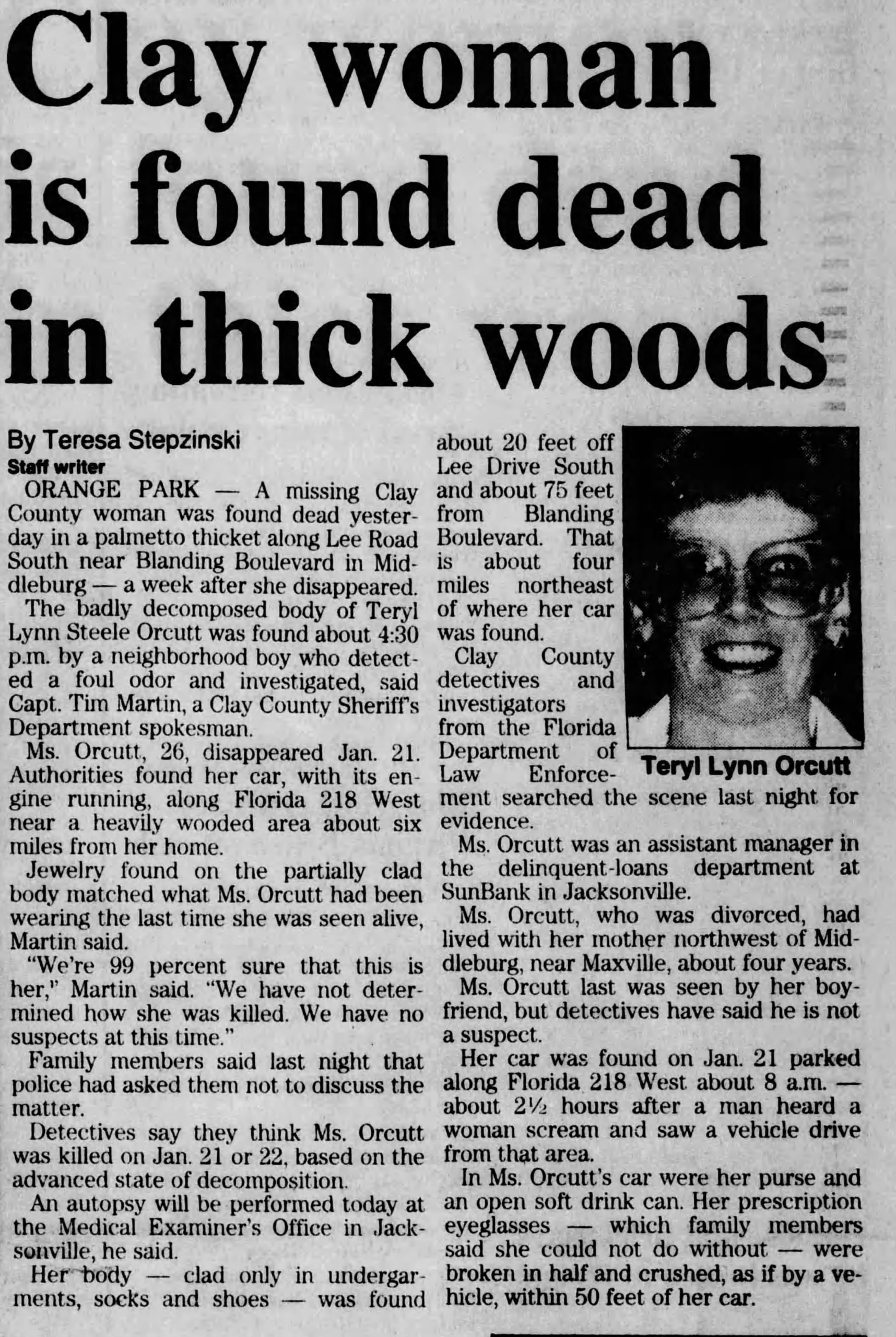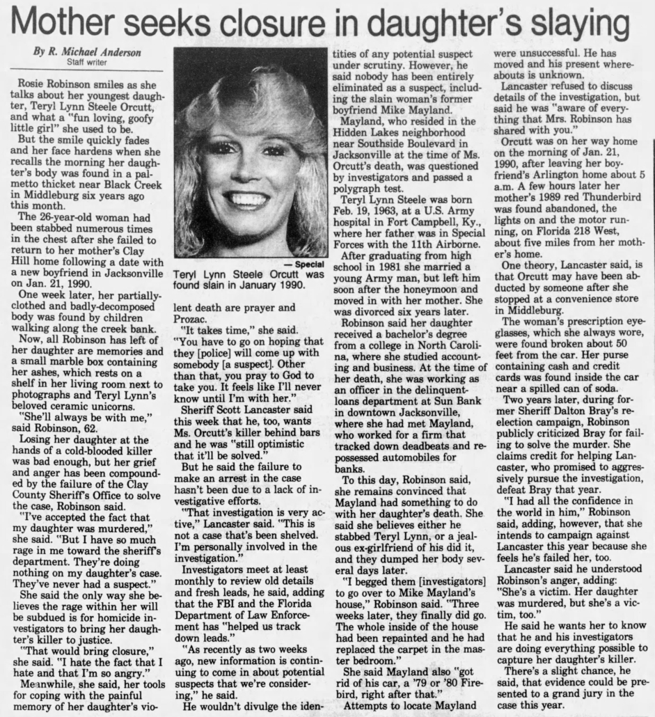 Anyone with information concerning Teryl Orcutt’s unsolved homicide is asked to call the Clay County Sheriff’s Office at (904) 264-6512. To remain anonymous and possibly be eligible for a reward, call First Coast Crime Stoppers at (866) 845-8477.