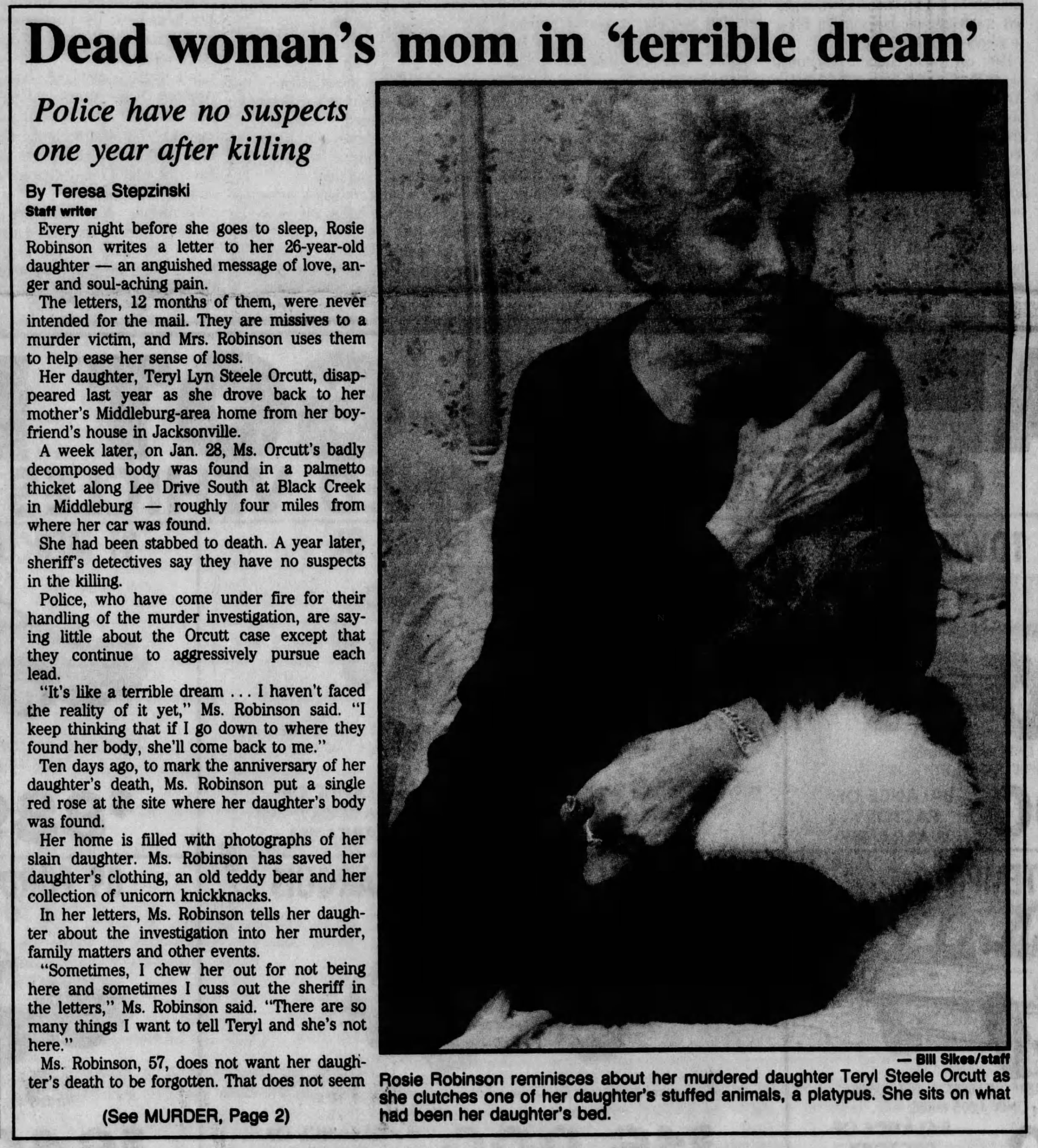 She was living with her mom in Middleburg, Florida, before the time of the murder. Teryl was looking to find her own apartment, to have her own space. She never told her mom; it was another secret between Teryl and her sisters. After nights out, Teryl would usually come back home before the newspaper arrived at 5 a.m. She would leave it at the kitchen bar for her mom. It was a sign that Teryl was back home.