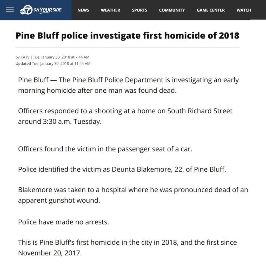 If you have any information on the unsolved homicide of Deunta Blakemore, please contact the Pine Bluff Police Department at (870) 730-2080. To remain anonymous and possibly be eligible for a reward, call the Crime Stoppers Hotline at (501) 340-8477.