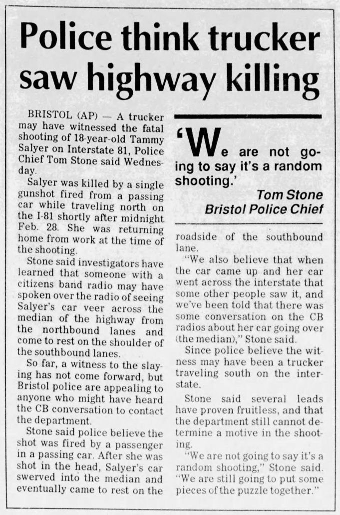 If you have any information on the unsolved murder of Tammy Salyer, please contact the Bristol Police Department at (276) 645-7400.