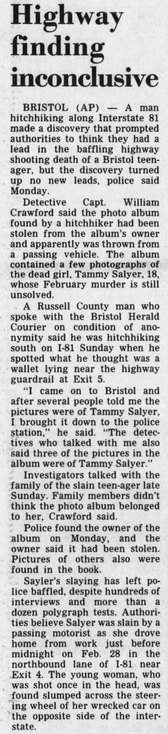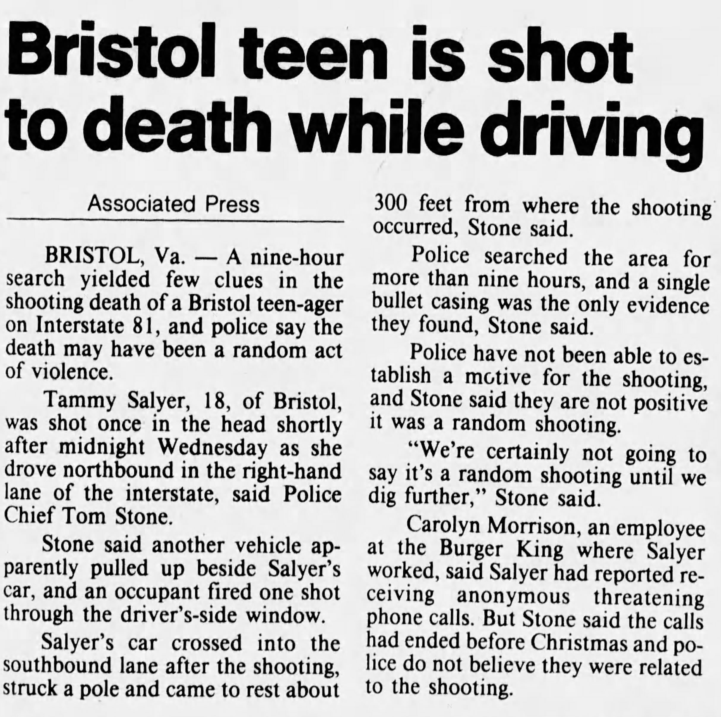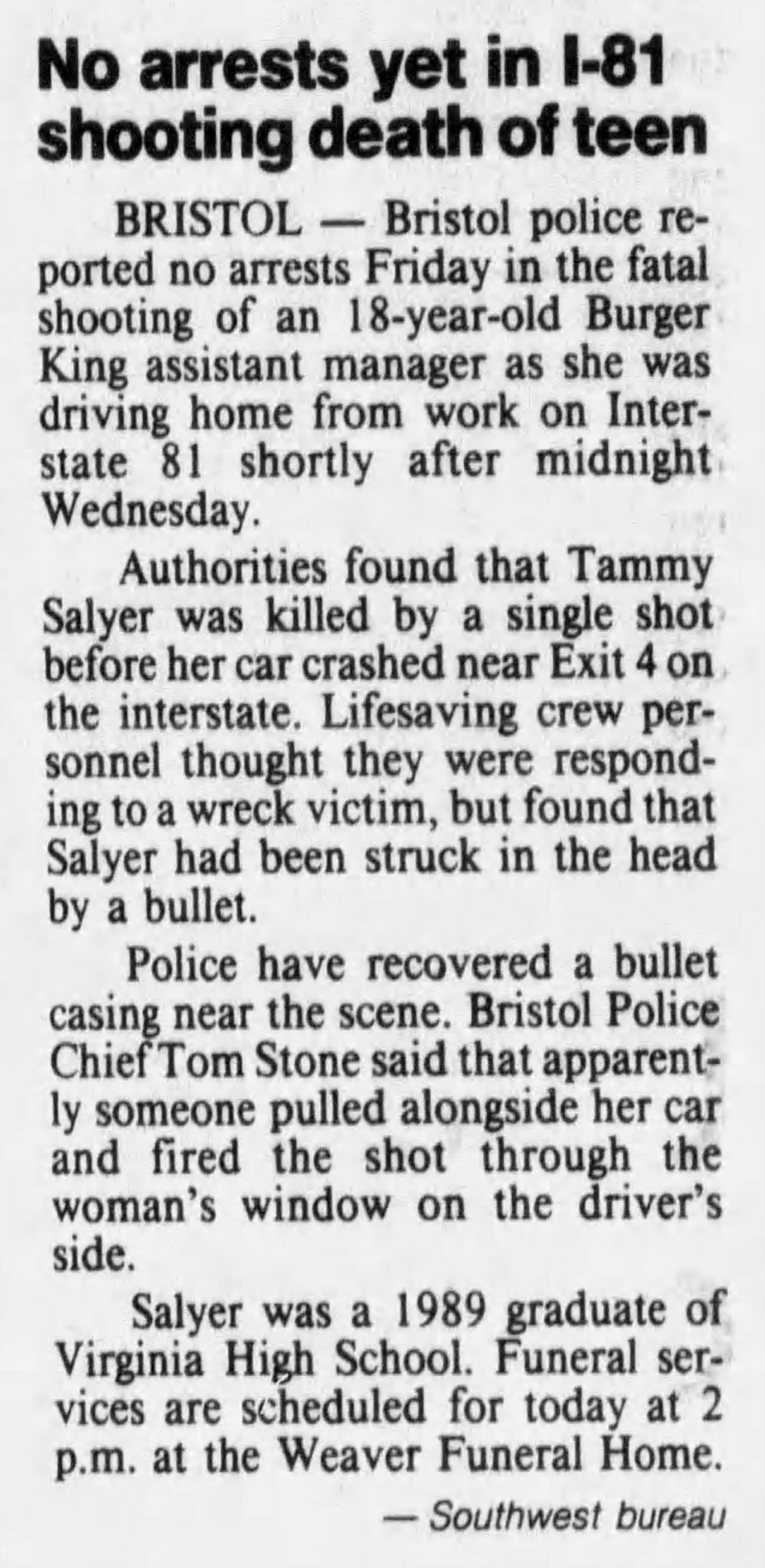 If you have any information on the unsolved murder of Tammy Salyer, please contact the Bristol Police Department at (276) 645-7400.