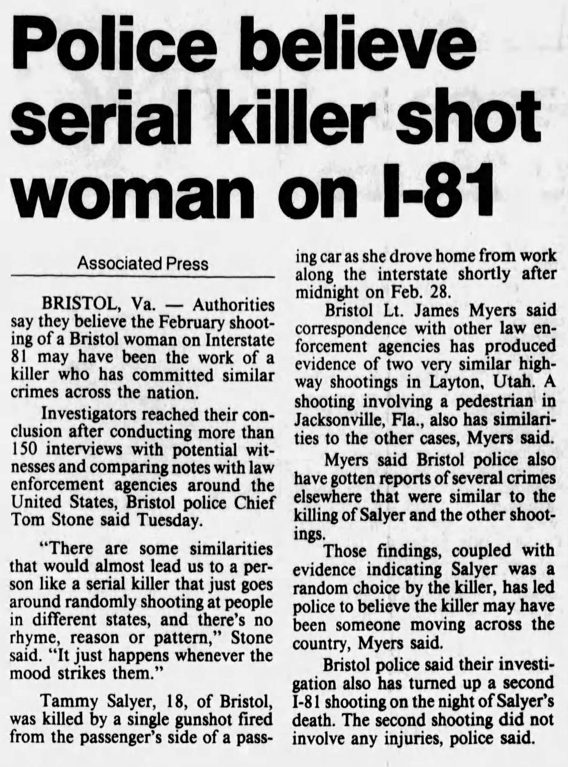 On the night of February 28, 1990, she was found dead in her car on Interstate 81, just three miles from her home in Bristol, Virginia. She had been shot to death.