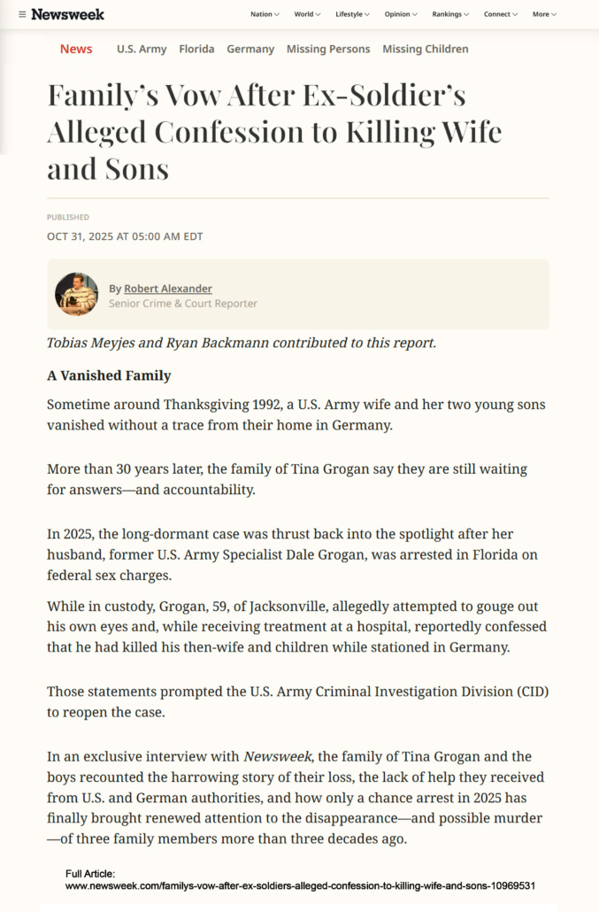 On January 18, 2025, Dale Grogan Sr. was arrested by the Nassau County Sheriff’s Office during a 4-day sting operation, named “Operation Deviant Sunrise” and “Operation Deviant Sunset,” in which officers posed as underage girls online. Once in custody, Grogan Sr. attempted to harm himself and was transferred to a medical facility where he made incriminating statements about the disappearance of Tina, Dale Jr., & Stephon in Germany in 1992.