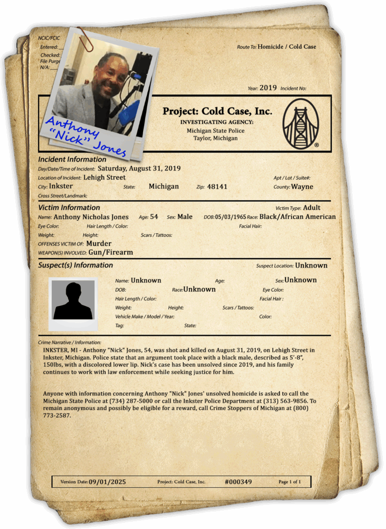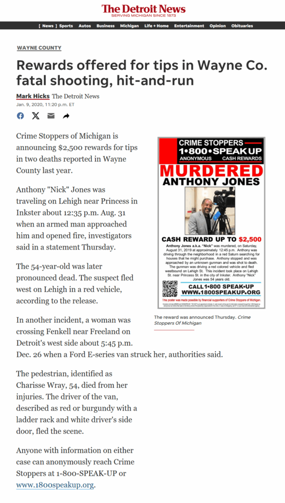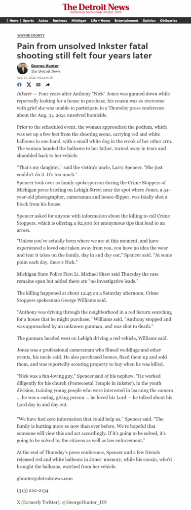 Anyone with information concerning Anthony “Nick” Jones’ unsolved homicide is asked to call the Michigan State Police at (734) 287-5000 or call the Inkster Police Department at (313) 563-9856. To remain anonymous and possibly be eligible for a reward, call Crime Stoppers of Michigan at (800) 773-2587.