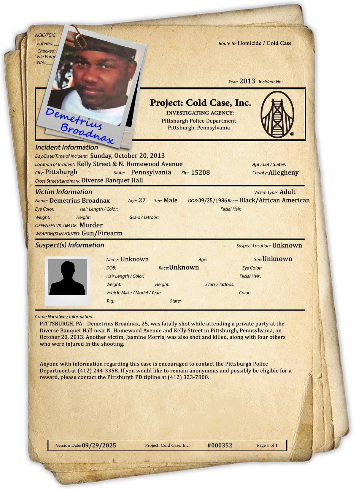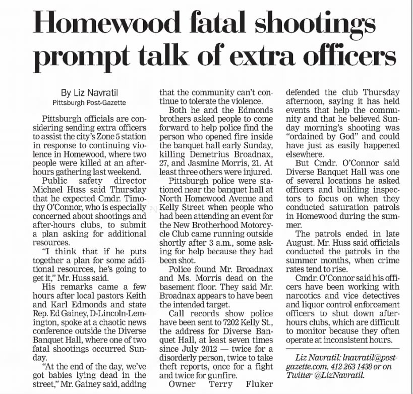Anyone with information regarding this case is encouraged to contact the Pittsburgh Police Department at (412) 244-3358. If you would like to remain anonymous and possibly be eligible for a reward, please contact the Pittsburgh PD Tipline at (412) 323-7800.