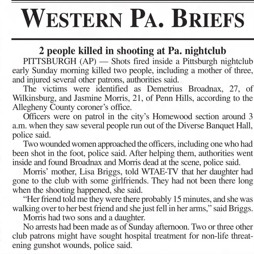On October 20, 2013, Demetrius Broadnax was at the Diverse Banquet Hall in Pittsburgh, attending a social event hosted by the New Brotherhood Motorcycle Club. Around 3 a.m., gunfire erupted inside the club, and six innocent people were shot. Demetrius and another young attendee, Jasmine Morris, were fatally wounded. Four other people inside the hall sustained non-life-threatening injuries as a result of the gunfire. “That was the worst day of my life,” Diana said. “I couldn’t talk. I couldn’t walk. A part of me left after he passed, and I will never be the same again.” Crystal remembers getting a call from her mom late that night. At first, she was confused and trying to piece together what exactly had happened, but the moment her mother said, “He’s gone,” everything shifted. “It was heartbreaking,” Crystal said.