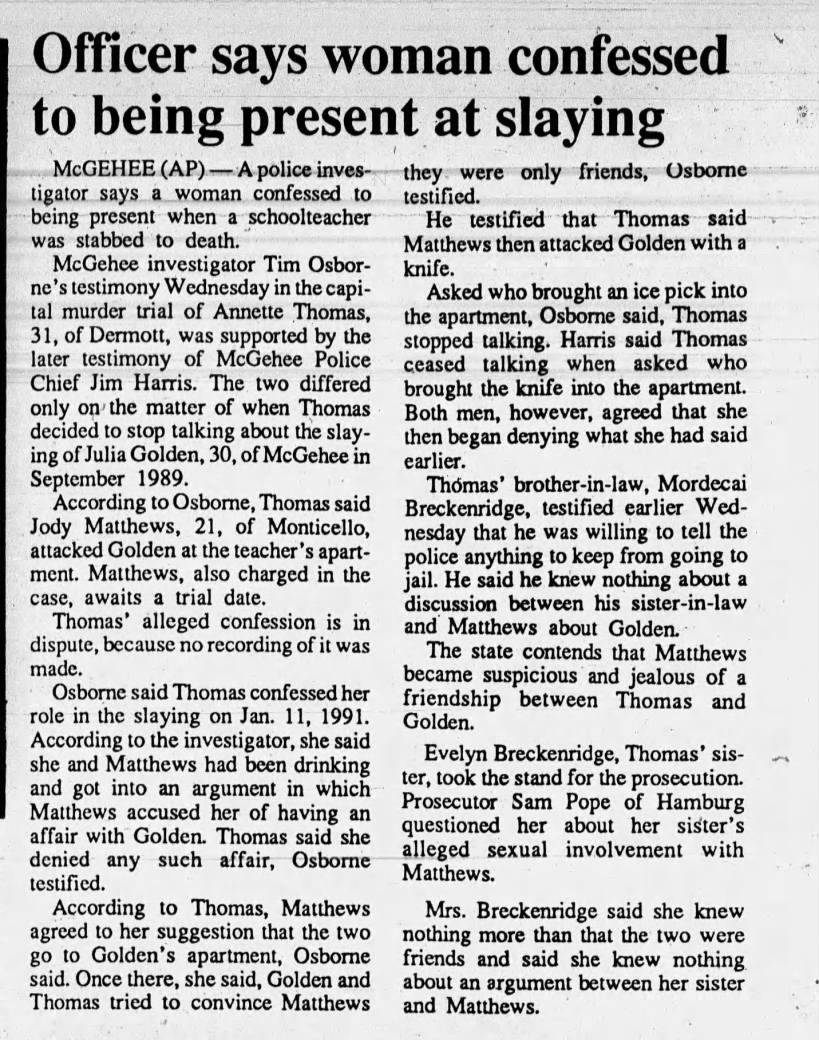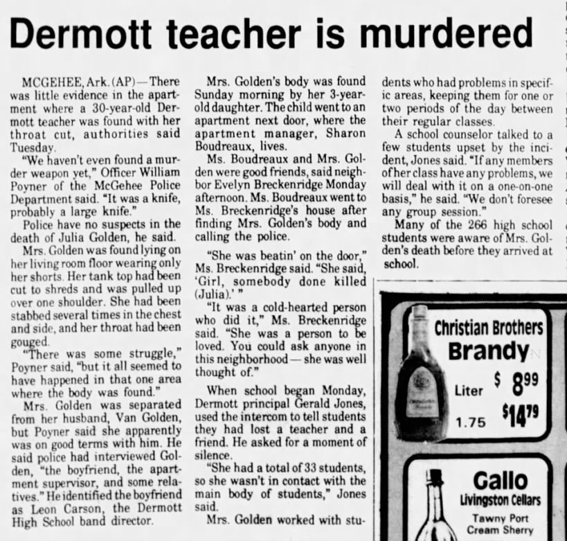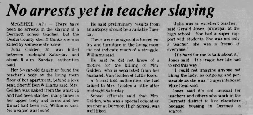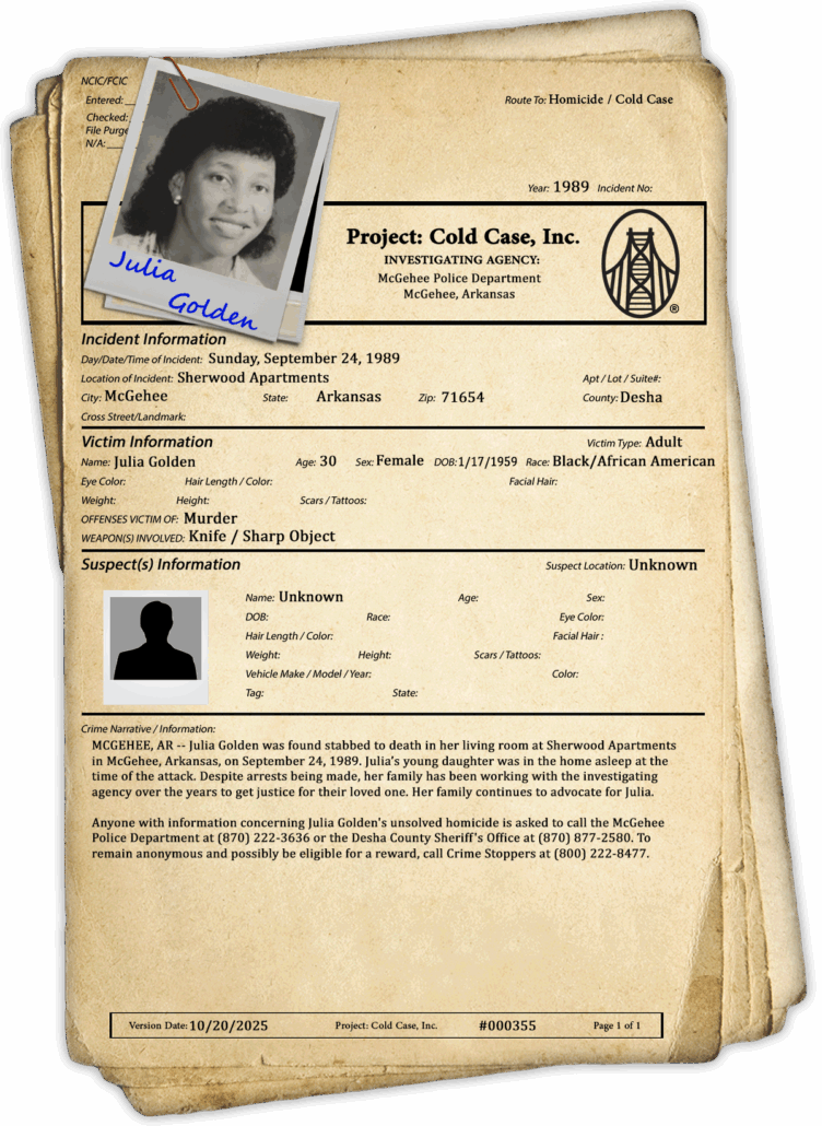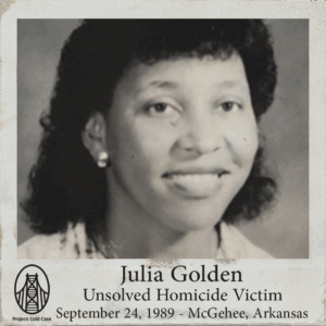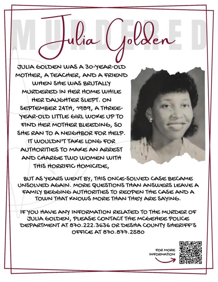 Anyone with information concerning Julia Golden’s unsolved homicide is asked to call the McGehee Police Department at (870) 222-3636 or the Desha County Sheriff’s Office at (870) 877-2580. To remain anonymous and possibly be eligible for a reward, call Crime Stoppers at (800) 222-8477.