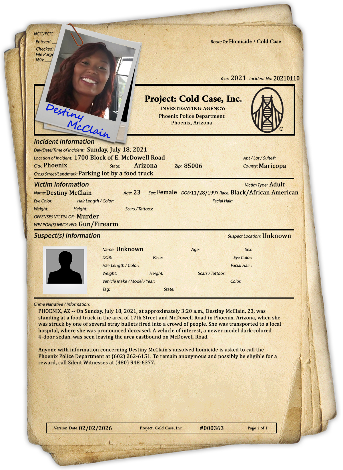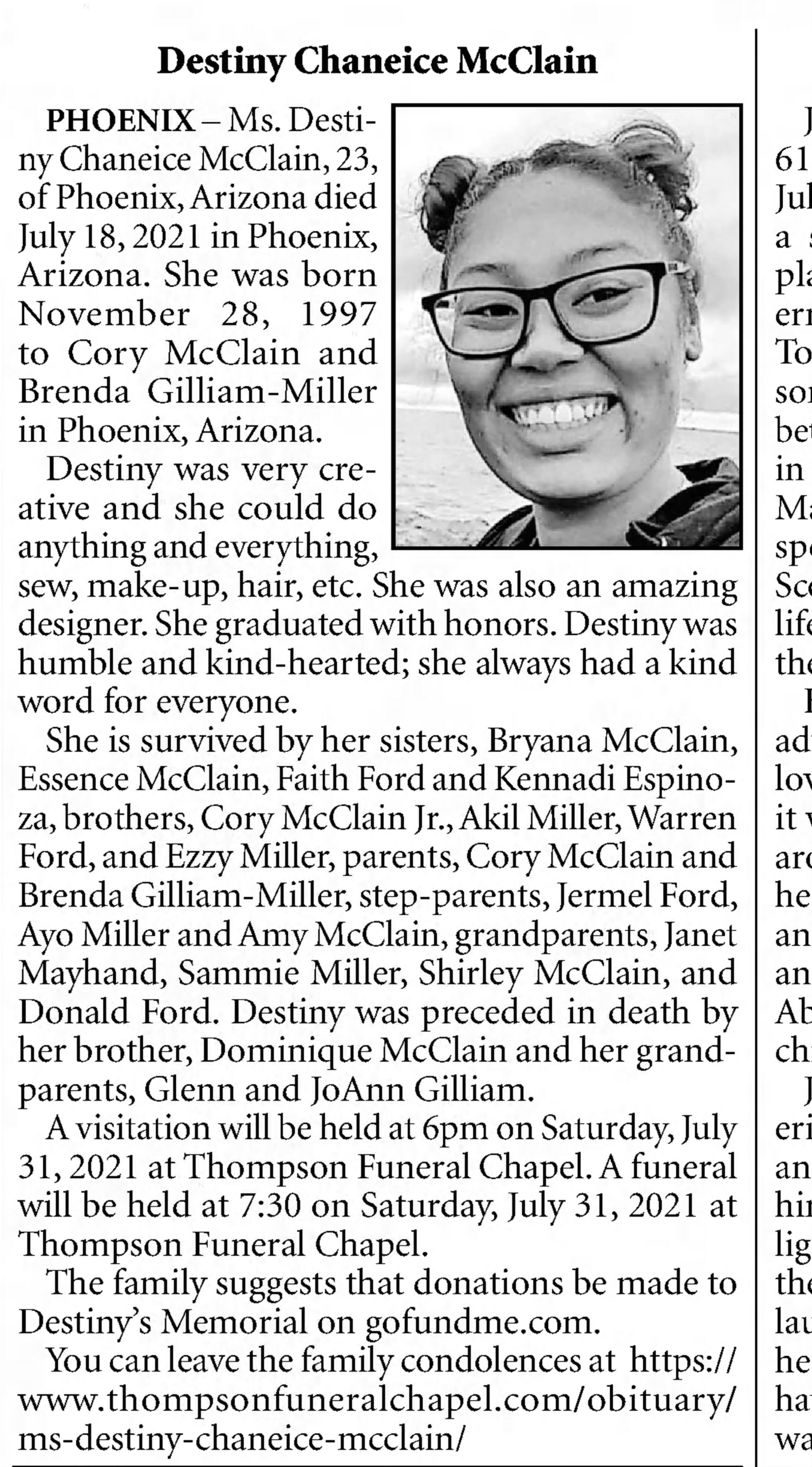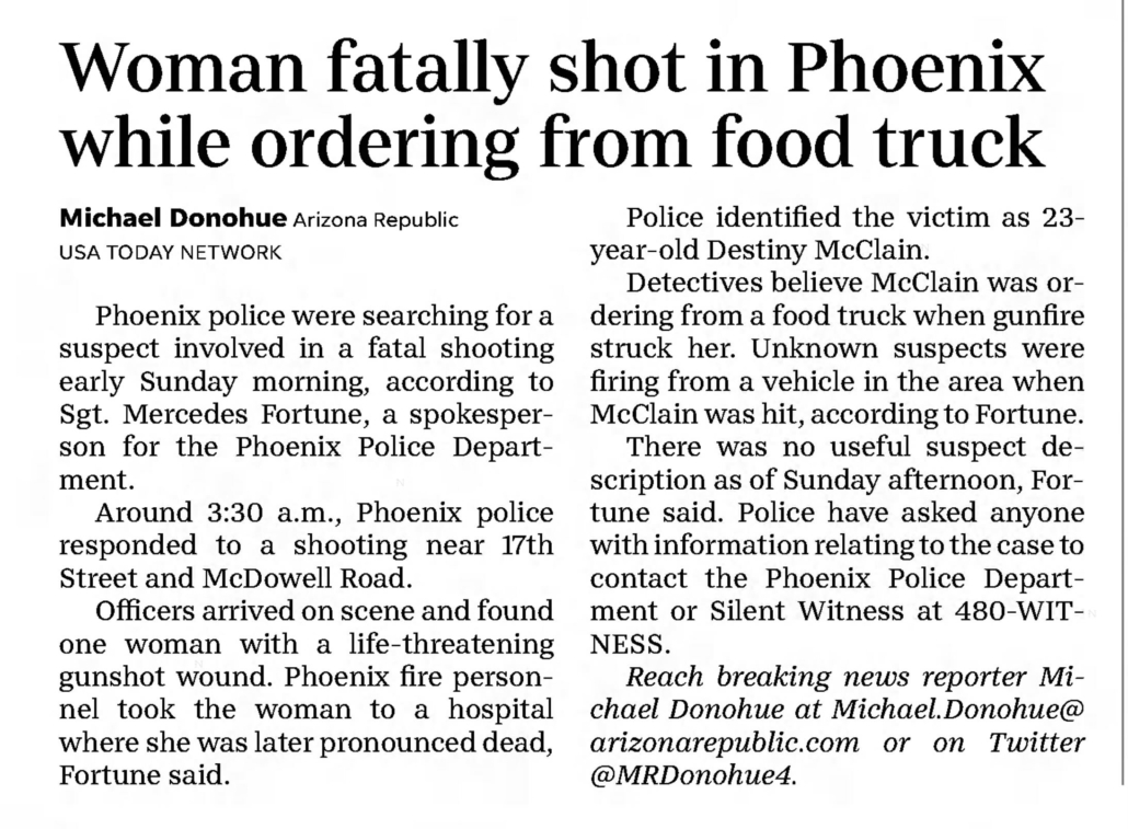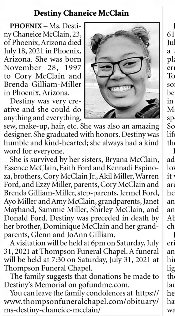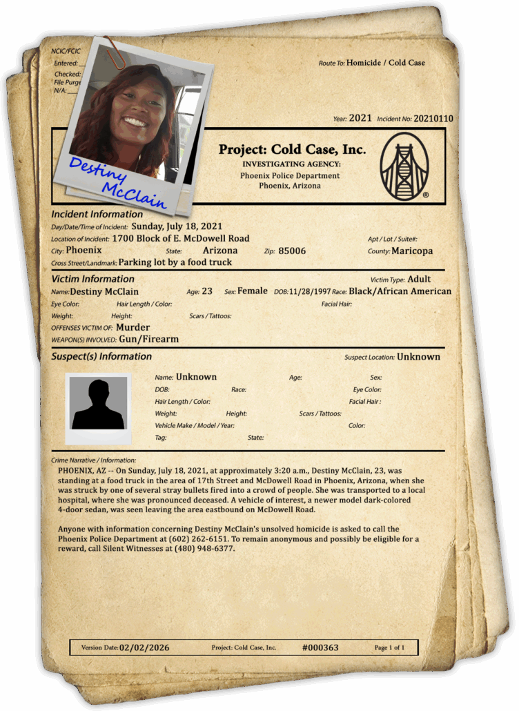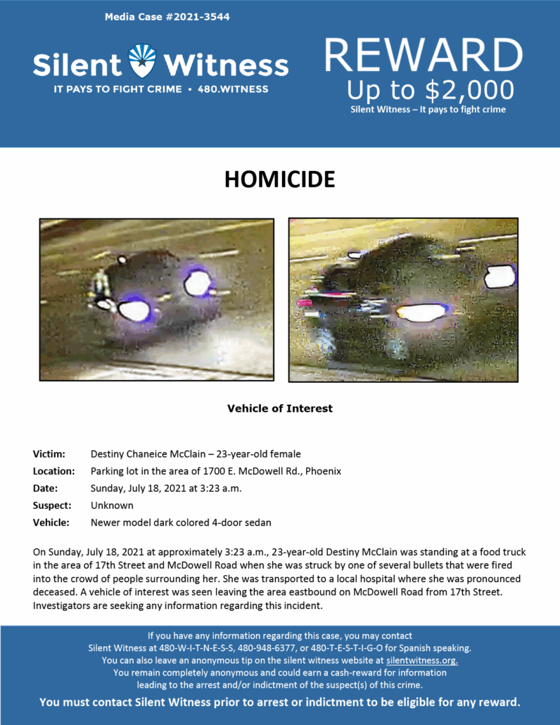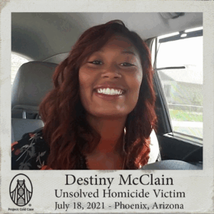 Anyone with information concerning Destiny McClain’s unsolved homicide is asked to call the Phoenix Police Department at (602) 262-6151. To remain anonymous and possibly be eligible for a reward, call Silent Witnesses at (480) 948-6377.