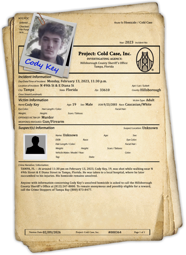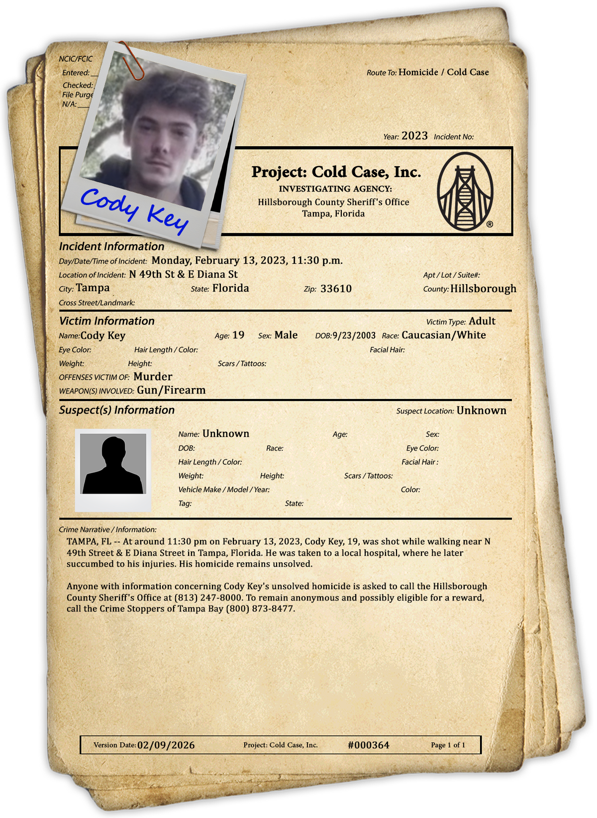 Anyone with information concerning Cody Key’s unsolved homicide is asked to call the Hillsborough County Sheriff’s Office at (813) 247‑8000. To remain anonymous and possibly be eligible for a reward, call Crime Stoppers of Tampa Bay at (800) 873-8477.