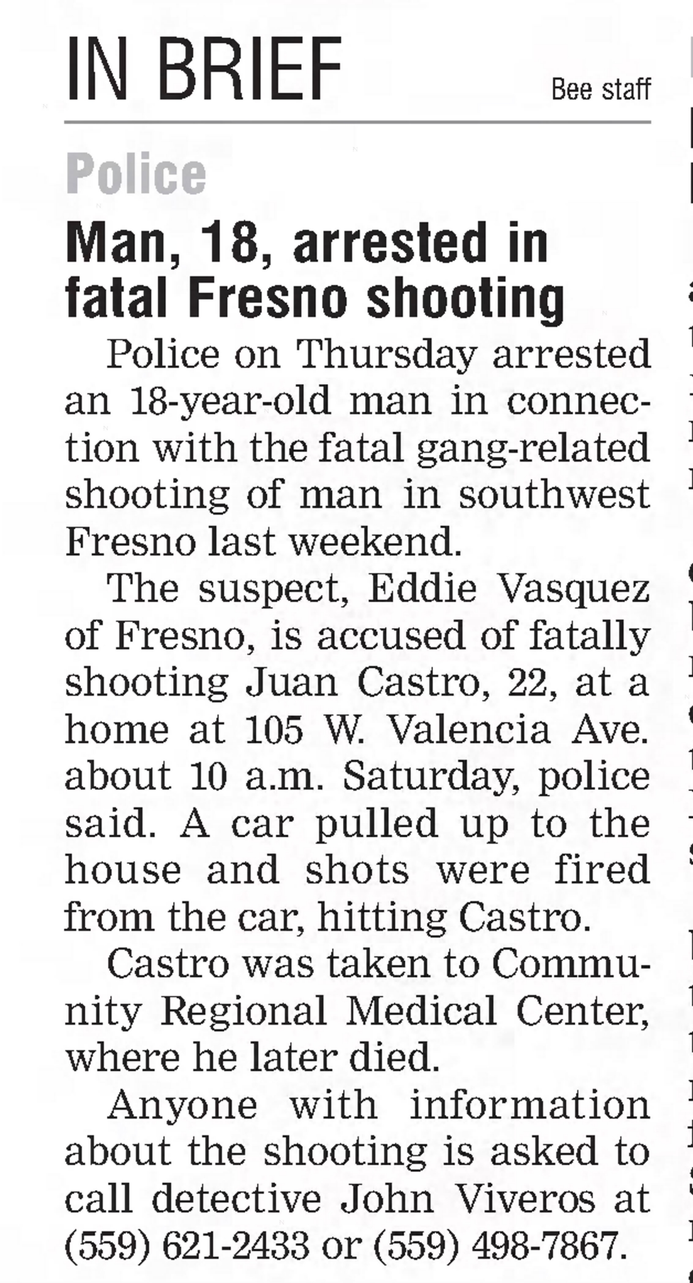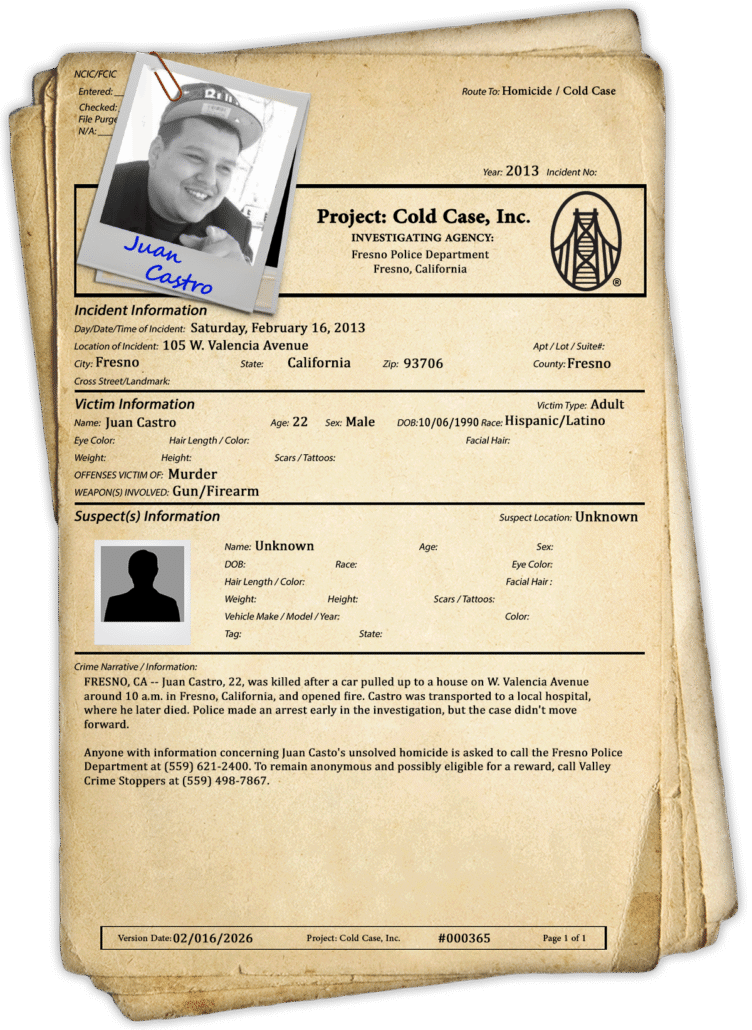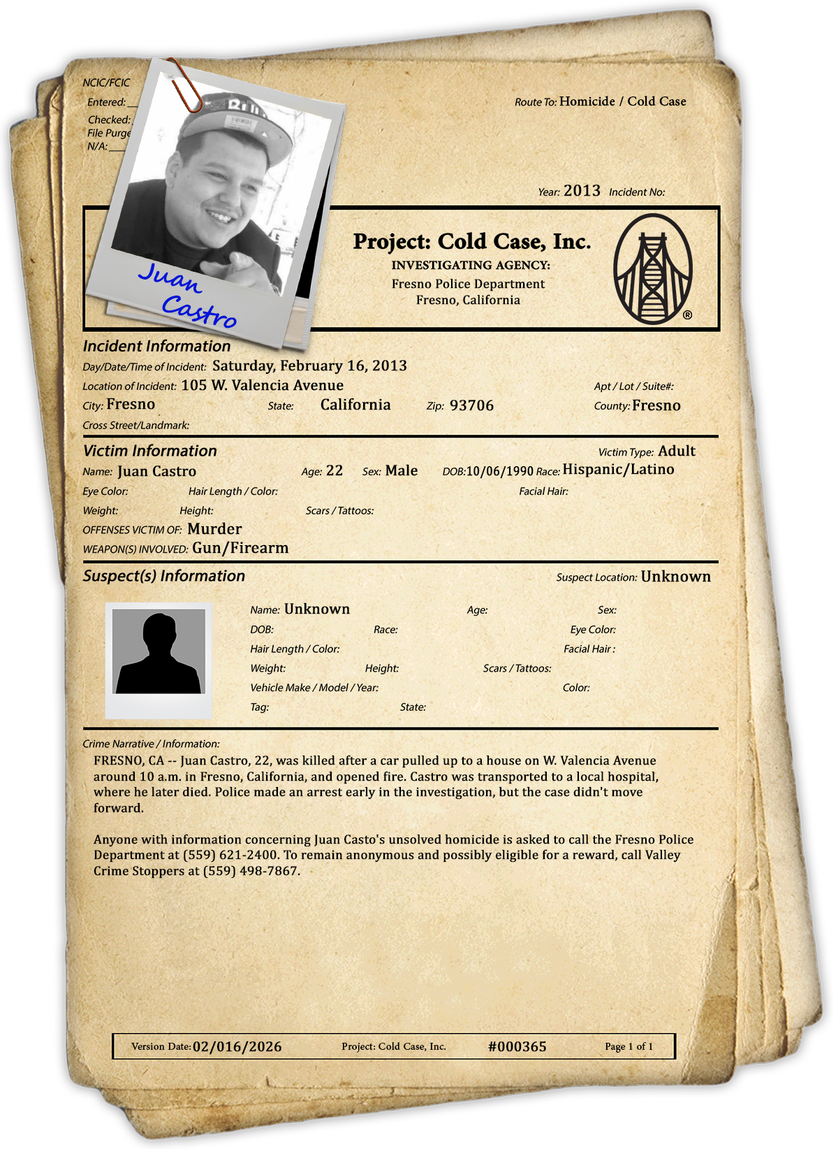 Anyone with information concerning Juan Casto’s unsolved homicide is asked to call the Fresno Police Department at (559) 621‑2400. To remain anonymous and possibly eligible for a reward, call Valley Crime Stoppers at (559) 498-7867.
