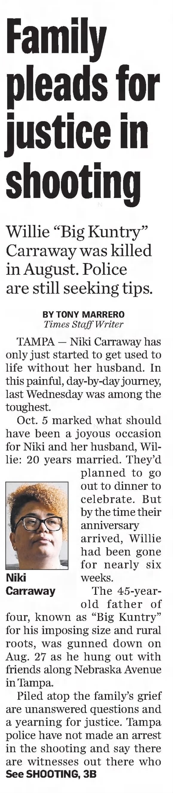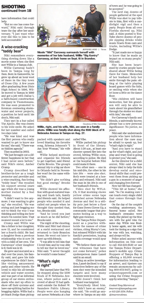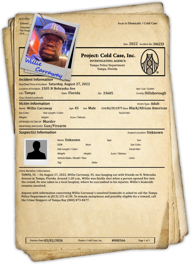 On August 27, 2022, Willie Carraway was tragically shot and killed on the 1500 block of N. Nebraska Avenue in Tampa, Florida. He was spending time with friends in front of the Robert W. Saunders Public Library when the shooting occurred around 1:20 AM. Two other adult males were struck by the gunfire but were later released from the hospital.