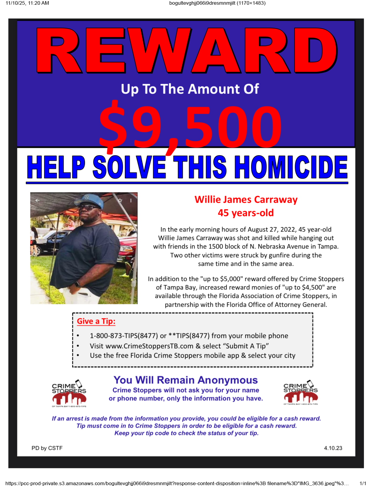 Anyone with information concerning Willie Carraway’s unsolved homicide is asked to call the Tampa Police Department at (813) 231-6130. To remain anonymous and possibly eligible for a reward, call the Crime Stoppers of Tampa Bay (800) 873-8477.